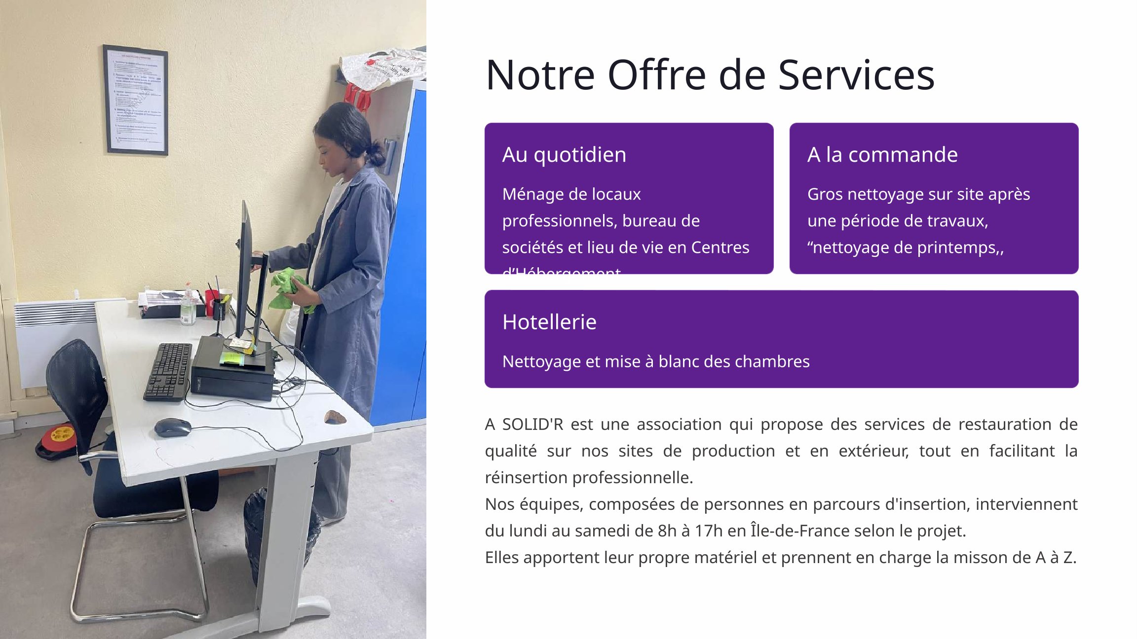 Nos prestations Le ménage 000100020003000400050006 Télécharger le document La restauration 0001000200030004000500060007 Télécharger le document